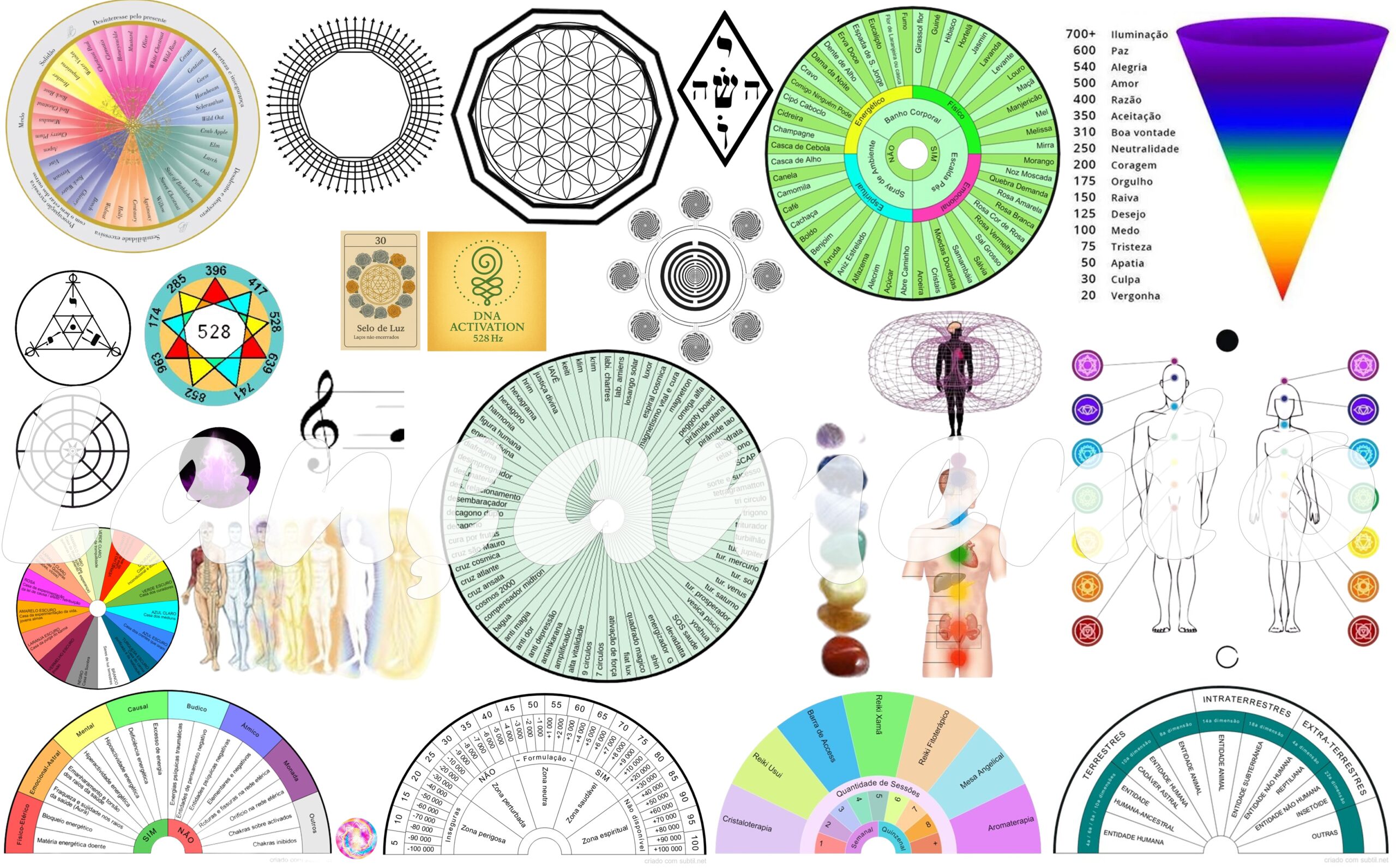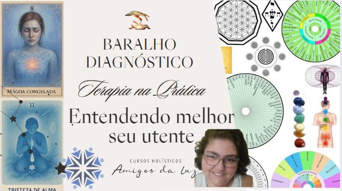 Esse curso contem um baralho com 34 cartas com situações que podem estar no campo do utente, e uma prancha quântica de ferramentas de tratamento com florais de Bach, ervas para banho, fitoterapia, cristaloterapia, aromaterapia, etc,