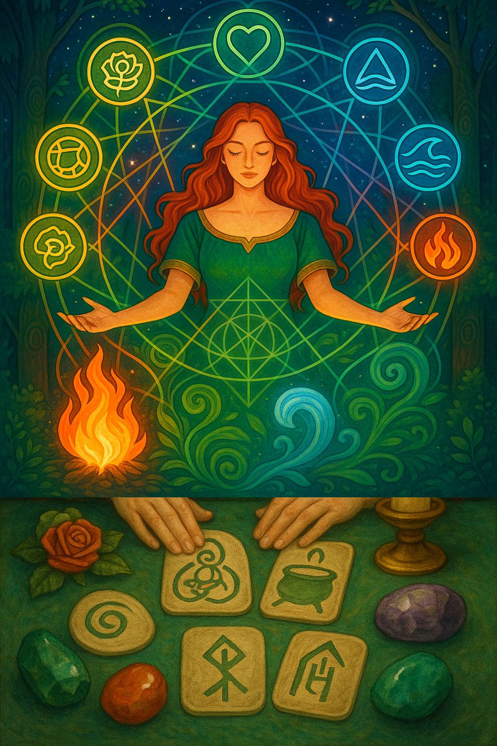 As runas de Esmeralda nos conecta ao seu ambiente a sua egregora nos conecta aos 5 elementos e nos ajuda através das runas não só a ler o oráculo, mas a tratar terapeuticamente com seus arquétipos através da magia das runas.